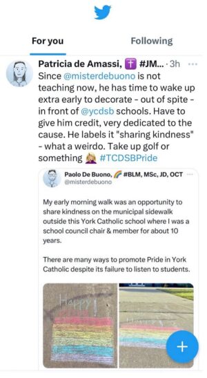 Un ex premier, i cui concetti personali di sessualità e famiglia non sono in linea con i valori cattolici, ha manifestato la sua disapprovazione per lo YCDSB su un feed di Twitter. La valanga di critiche nei confronti della tattica ha raggiunto livelli stratosferici.