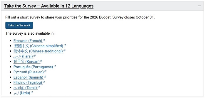 Inoltre, i cittadini di Toronto possono compilare un sondaggio online sul bilancio entro il 31 ottobre. Tale sondaggio, come si può scoprire facilmente cliccando sull’apposito link nel sito del Comune di Toronto (qui), è in ben dodici lingue, come si vede nello screenshot in alto: giustamente, vista la multietnicità di una città il cui stesso sindaco, Olivia Chow, è figlia di immigrati cinesi. Peccato che fra le lingue manchi l’Italiano, cioè la lingua di una delle più importante e grandi comunità di Toronto praticamente da quando la città è nata. Il sondaggio può invece essere effettuato nelle seguenti lingue: Inglese, Francese, Portoghese, Spagnolo, Cinese semplificato e tradizionale, Coreano, Farsi, Filippino, Russo, Tagalog, Tamil e Urdu.