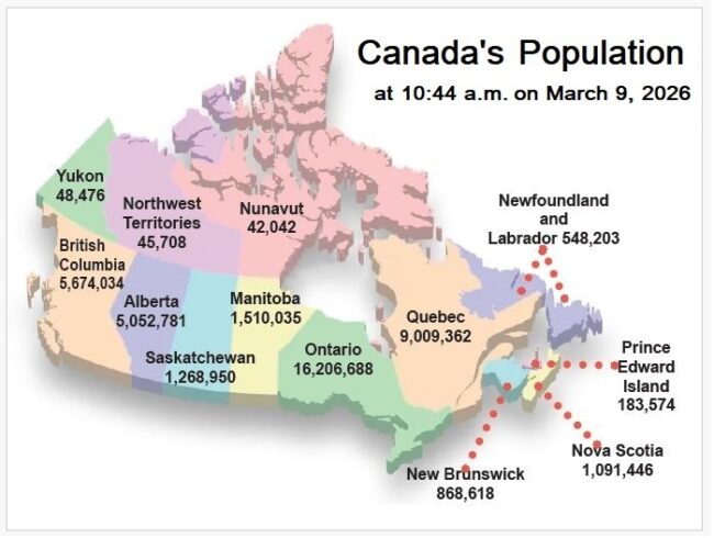 One thing for certain is that it is a country in population freefall. Deaths are surpassing births (click on the Statistics Canada site – from which attached map, below, is derived – for a minute-by-minute change: here). The most significant factor, from my perspective, driving the “growth of this vast territory north of the 49Th parallel was the vision by early prime ministers to create a unified country capable of developing its immense natural resources for a population able to compete internationally independently of the USA and Britain.