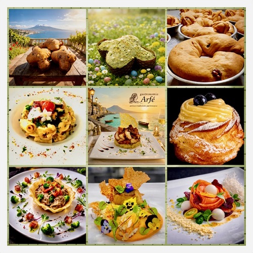 Per lo Chef Antonio Arfè, creare un nuovo piatto significa esprimere se stessi: ogni gesto in cucina è simile a comporre una melodia, dove gli ingredienti diventano note e l’armonia del piatto racconta la personalità di chi cucina. Le sue creazioni sono legate al bagaglio culturale culinario basato sulla vera tradizione napoletana e propone, infatti, diversi piatti della cucina partenopea ma rivisitati secondo il suo gusto creativo ma che, comunque, mantengono un legame indissolubile con Napoli. Più che un’attività commerciale, la Gastronomia Arfè è oggi un vero punto d’incontro per appassionati di gastronomia, dove si propongono i più svariati prodotti d’eccellenza nel campo dei salumi e dei formaggi, sempre di primissima qualità, con un’ampia selezione di prodotti tipici. E poi i loro vassoi ed i taglieri addobbati con le loro molteplici specialità, le torte, le pizze rustiche, i tortani e le sfoglie di scarola, di salsicce e friarielli, di peperoni e provola, di melanzane e provola, la frolla rustica, il babà rustico, il danubio, le crostate di ricotta e verdure e tanto altro, tutte di loro esclusiva produzione, non dimenticando, infine, i loro eccezionali panettoni con lievito madre e le loro colombe pasquali. Info sullo Chef Arfè: https://www.gastronomia-arfè.it