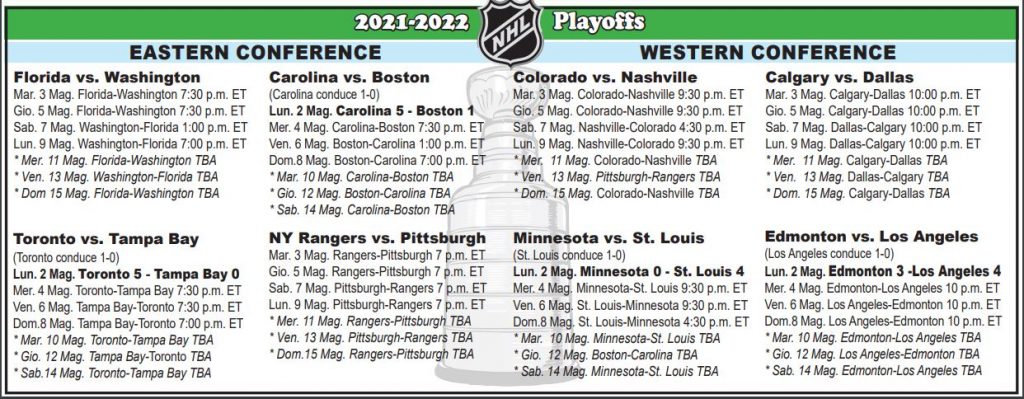 TORONTO – Ecco il calendario dei playoff NHL con tutti gli incontri in programma, le date e gli orari.