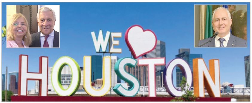 In alto, la città di Houston (foto da Twitter X – @HoustonTX) e, nelle due foto ai lati, da sinistra: Fucsia Nissoli-Fitzgerald con il ministro degli Affari Esteri, Antonio Tajani; Vincenzo Arcobelli del Consiglio Generale degli Italiani all’Estero