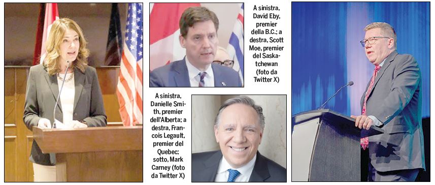 Nelle foto in alto, i premier Danielle Smith (Alberta), David Eby (British Columbia), Francois Legault (Quebec) e Scott Moe (Scaskatchewan), ed il primo ministro Mark Carney (foto/screenshot dai rispettivi profili Twitter X)