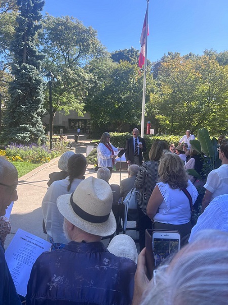 Alla cerimonia hanno partecipato numerose personalità – fra le quali l’Onorevole Joe Volpe, Editore del Corriere Canadese – e naturalmente anche i familiari di Olga. In particolare, Rochelle Zorzi ha letto una poesia, “The Bench” (Anonymous). Eccola: Here, where sunlight spills on stone and leaf / We’ve placed a bench to cradle grief. / But also joy, and thought, and time- / a space for rest, a pause, a sign. / She sat with minds, she shaped, she stirred- / With gentle hands, with patient words. / A seeker, guide, and friend to all, / Whose quiet strength would lift, not stall. / Now every breeze that brushes by / Whispers of questions, truth, and why. / This bench is more than wood and steel- / It holds the love we still can feel. / So sit awhile, recall her name, / Her spark, her voice, her steady flame. / In silence, thought, or quiet talk- / She walks with us on this same walk.