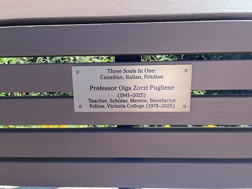 TORONTO – Si è svolta domenica pomeriggio al Victoria College Quadrangle, presso l’Università di Toronto, la cerimonia in memoria della Proffessoressa Olga Zorzi Pugliese, scomparsa un anno fa. Per l’occasione, è stata svelata in suo onore una panchina con una targa che la ricorda come insegnante ma anche come benefattrice e mentore, dalla tre anime: Canadese, Italiana e Friulana.