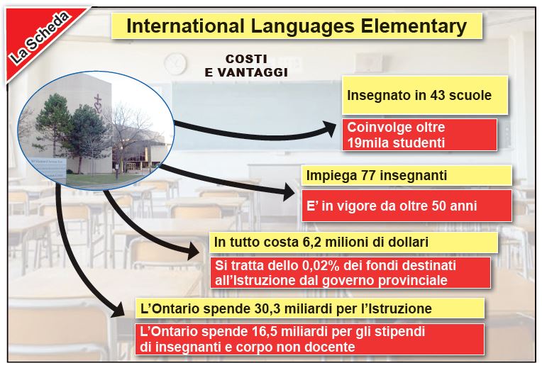 Ma si tratta davvero di una goccia d’acqua nell’oceano rappresentato dalle spese che la provincia stanzia ogni anno per l’istruzione. Se prendiamo il Budget presentato la scorsa settimana a Queen’s Park, l’Ontario il prossimo anno spenderà in tutto 30,3 miliardi di dollari: i 6,2 milioni che servono per il programma rappresentano lo 0,02 per cento del totale. E visto che la somma serve soprattutto per coprire lo stipendio dei 77 insegnanti impiegati per il programma, allora diventa utile sapere che la Provincia spende ogni anni circa 16,5 miliardi per gli stipendi del corpo docente e non docente: la cifra necessaria per mantenere in vita il programma è appena lo 0,04 per cento del totale.