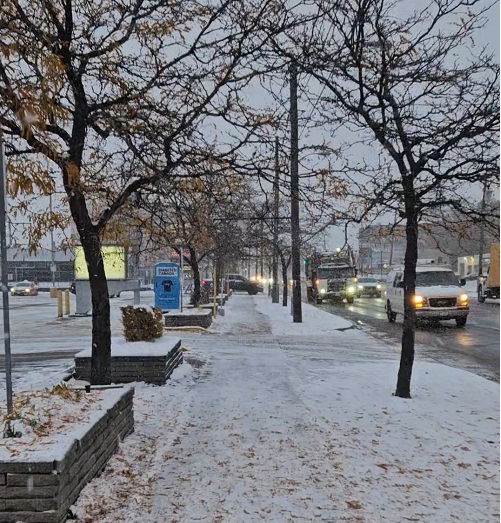 In alto, Dufferin Street sotto la neve ieri mattina (foto: Marzio Pelù – Corriere Canadese)