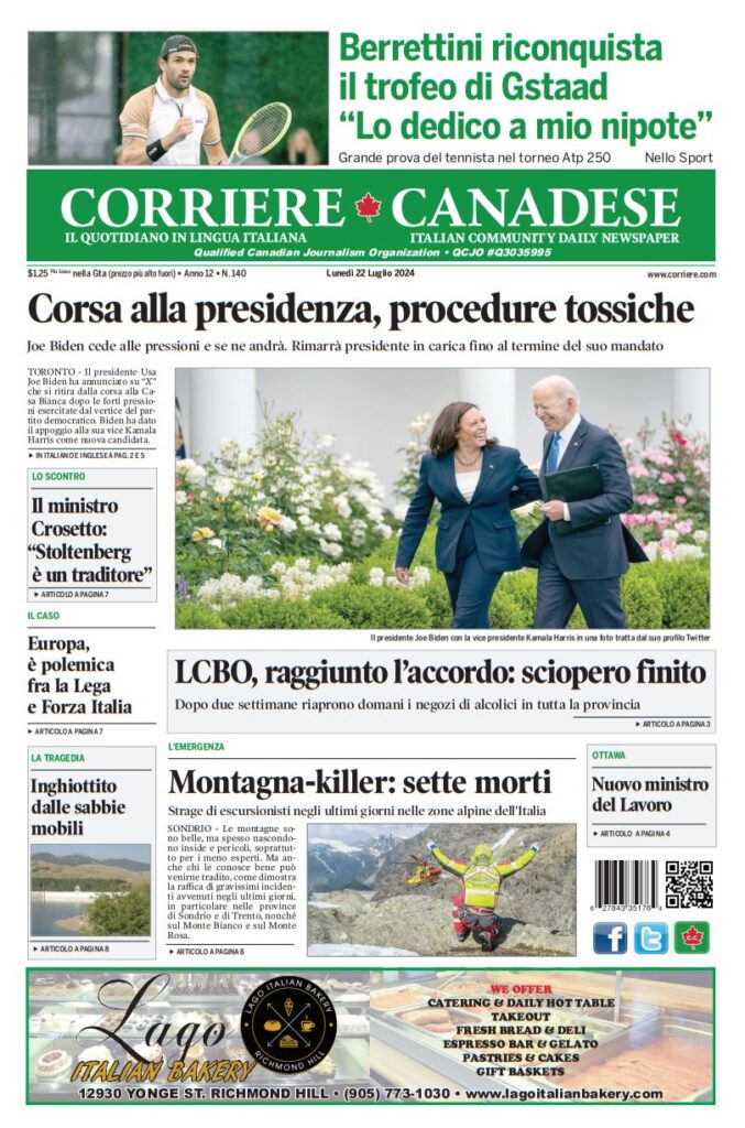 In edicola La nostra “vetrina” corriere canadese July 22, 2024 Clicca sull’immagine per ingrandirla (Cliccate qui per scaricare la prima pagina in formato .pdf) More Articles by the Same Author: Il viceministro del Made in Italy a Montreal e Toronto: due pagine specialiLe piste ciclabili trasformano Toronto in città dei grandi canaliSnow melt: Bike Lanes become Flood LanesLa nostra “vetrina”La nostra “vetrina”Share This Post - Condividi
