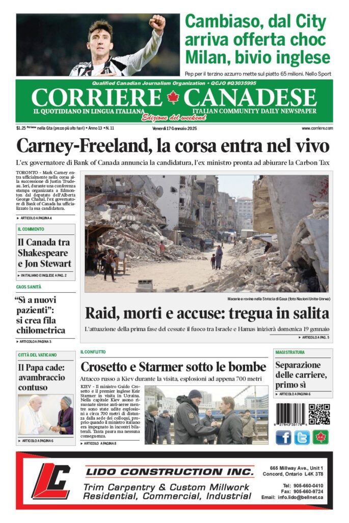 In edicola La nostra “vetrina” corriere canadese January 17, 2025 Clicca sull’immagine per ingrandirla (Cliccate qui per scaricare la prima pagina in formato .pdf) More Articles by the Same Author: Il viceministro del Made in Italy a Montreal e Toronto: due pagine specialiLe piste ciclabili trasformano Toronto in città dei grandi canaliSnow melt: Bike Lanes become Flood LanesLa nostra “vetrina”La nostra “vetrina”Share This Post - Condividi