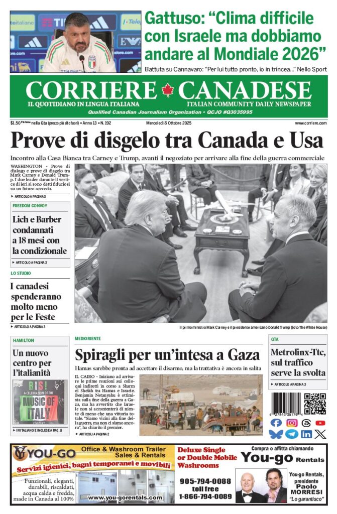 In edicola La nostra “vetrina” corriere canadese October 8, 2025 Clicca sull’immagine per ingrandirla (Cliccate qui per scaricare la prima pagina in formato .pdf) More Articles by the Same Author: CIBPA, 73rd President’s Ball: due pagine specialiLa nostra “vetrina”La nostra “vetrina”La nostra “vetrina”YCDSB, il genitore di uno studente: “Il razzismo esiste ed è contro i bianchi”Share This Post - Condividi
