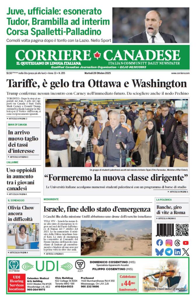 In edicola La nostra “vetrina” corriere canadese October 28, 2025 Clicca sull’immagine per ingrandirla (Cliccate qui per scaricare la prima pagina in formato .pdf) More Articles by the Same Author: La nostra “vetrina”L’Ambasciatore Cattaneo alla House of Commons con i deputati e senatori canadesiLa nostra “vetrina”La nostra “vetrina”I Blue Jays nella storia: ora la finalissima contro i Los Angeles DodgersShare This Post - Condividi