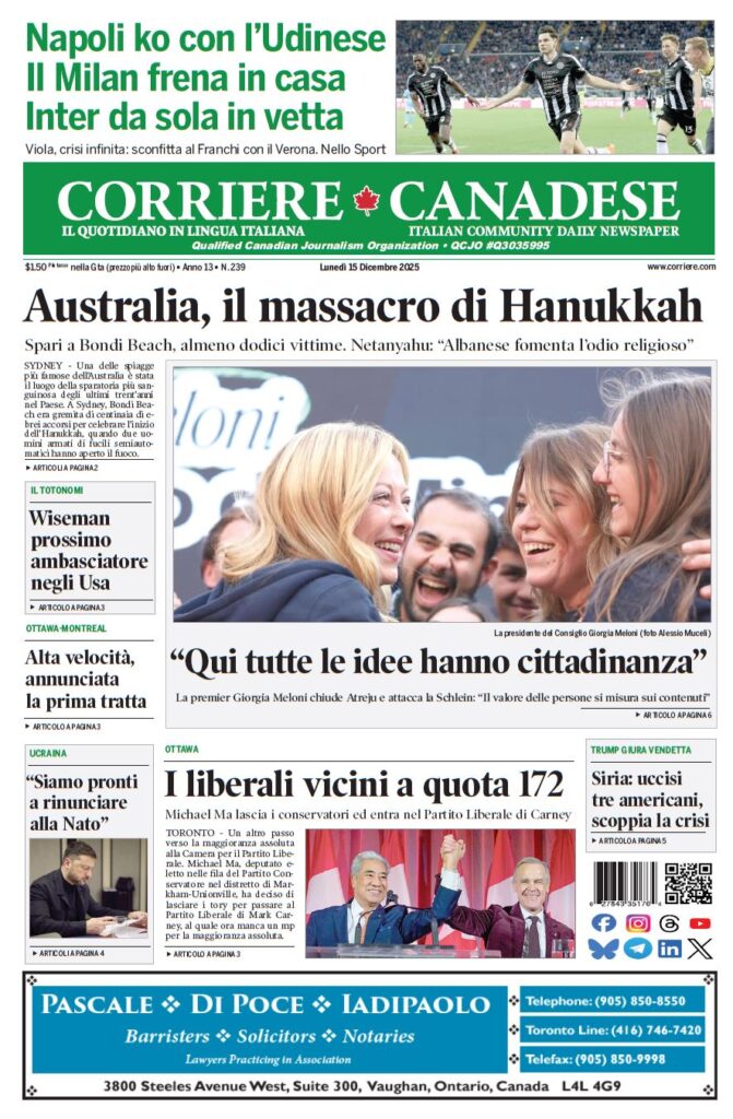 In edicola La nostra “vetrina” corriere canadese December 15, 2025 Clicca sull’immagine per ingrandirla More Articles by the Same Author: Il viceministro del Made in Italy a Montreal e Toronto: due pagine specialiLe piste ciclabili trasformano Toronto in città dei grandi canaliSnow melt: Bike Lanes become Flood LanesLa nostra “vetrina”La nostra “vetrina”Share This Post - Condividi