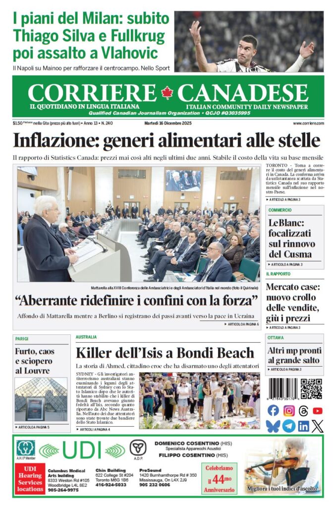 In edicola La nostra “vetrina” corriere canadese December 16, 2025 Clicca sull’immagine per ingrandirla More Articles by the Same Author: La nostra “vetrina”Le piste ciclabili trasformano Toronto in città dei grandi canaliSnow melt: Bike Lanes become Flood LanesLa nostra “vetrina”La nostra “vetrina”Share This Post - Condividi