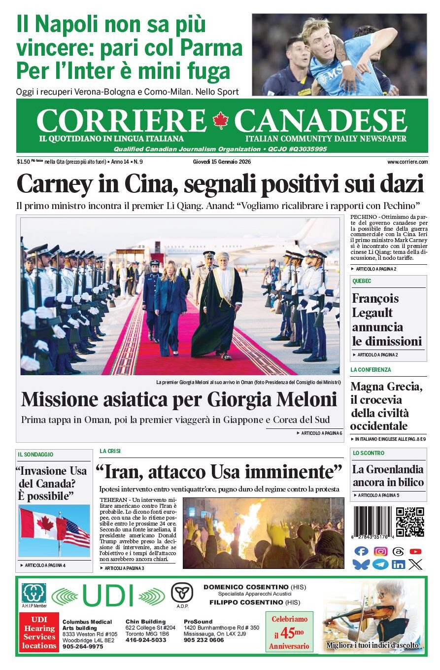 In edicola La nostra “vetrina” corriere canadese January 15, 2026 Clicca sull’immagine per ingrandirla More Articles by the Same Author: La “mozzarella in carrozza napoletana”I ‘paccherini al melograno’ con gli scampi, i pomodorini e l’olio al basilicoLa nostra “vetrina”Celebrando Leonardo Sciascia: una “Passeggiata” per portare la cultura siciliana in CanadaHappy birthday, Sciascia!Share This Post - Condividi