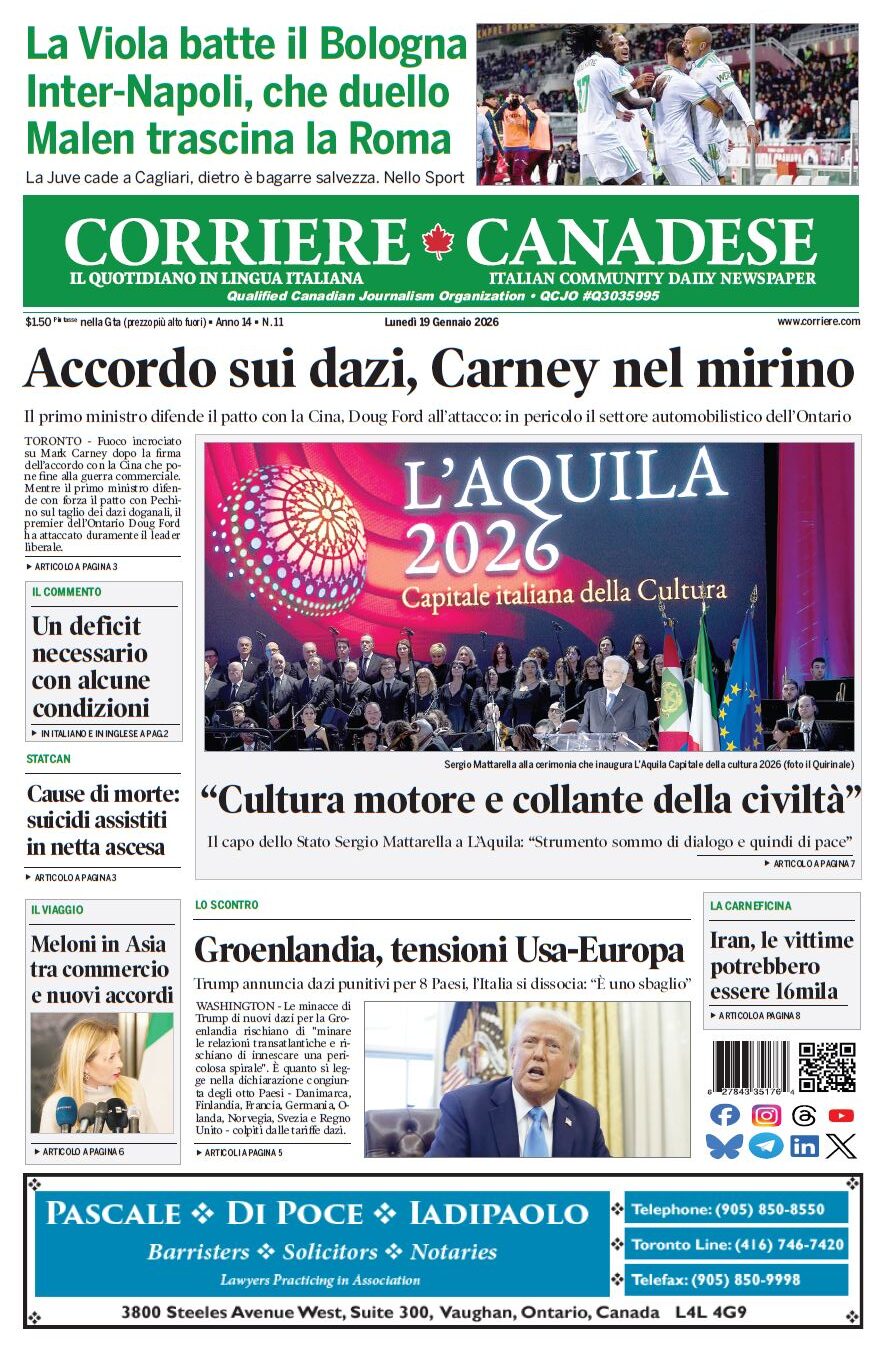 In edicola La nostra “vetrina” corriere canadese January 19, 2026 Clicca sull’immagine per ingrandirla More Articles by the Same Author: La nostra “vetrina”Referendum, gli Italiani iscritti all’AIRE possono votare per posta oppure in Italia: ecco come fareLa Magna Grecia sotto i riflettori a Toronto: due pagine specialiPressing sulla comunità internazionale: non dimenticatevi dell’IranLa nostra “vetrina”Share This Post - Condividi