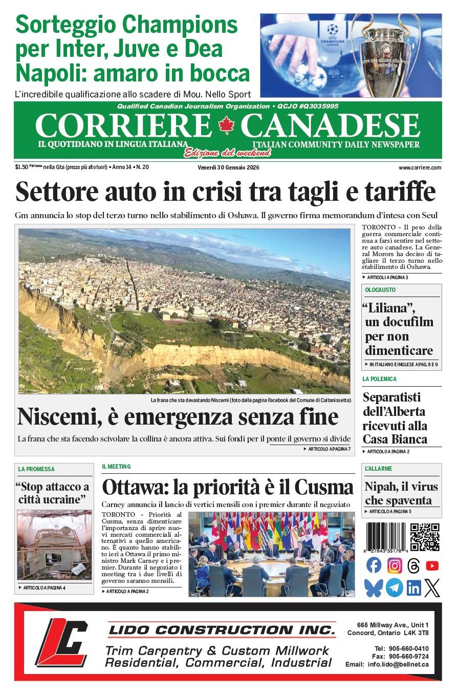 In edicola La nostra “vetrina” corriere canadese January 30, 2026 Clicca sull’immagine per ingrandirla More Articles by the Same Author: “Liliana” commuove il pubblico di Toronto. Memoria, serie di iniziative dell’AmbasciataLa nostra “vetrina”Il “sartù napoletano”Ed ecco i tagliolini con sfilaccini d’asinoLa nostra “vetrina”Share This Post - Condividi