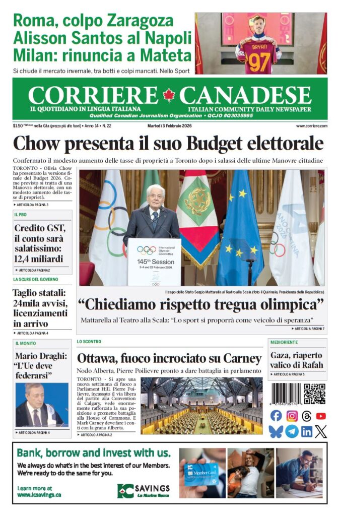 In edicola La nostra “vetrina” corriere canadese February 3, 2026 Clicca sull’immagine per ingrandirla More Articles by the Same Author: Mario, di nuovo italiano dopo quasi 70 anniLa nostra “vetrina”La nostra “vetrina”“Liliana” commuove il pubblico di Toronto. Memoria, serie di iniziative dell’AmbasciataLa nostra “vetrina”Share This Post - Condividi