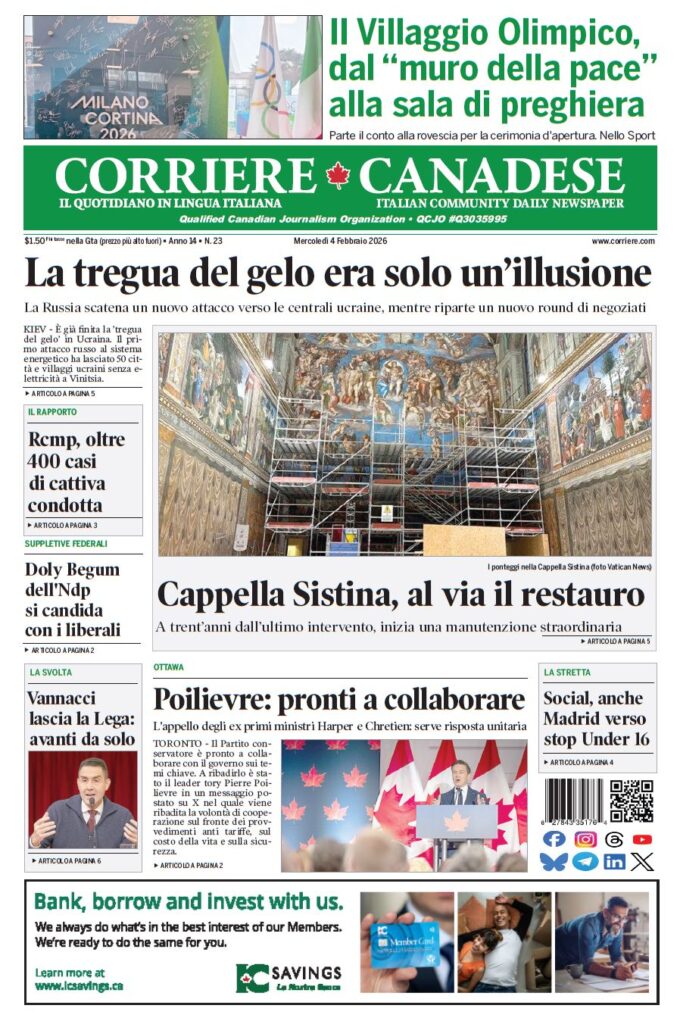 In edicola La nostra “vetrina” corriere canadese February 4, 2026 Clicca sull’immagine per ingrandirla More Articles by the Same Author: La nostra “vetrina”Mario, di nuovo italiano dopo quasi 70 anniLa nostra “vetrina”La nostra “vetrina”“Liliana” commuove il pubblico di Toronto. Memoria, serie di iniziative dell’AmbasciataShare This Post - Condividi