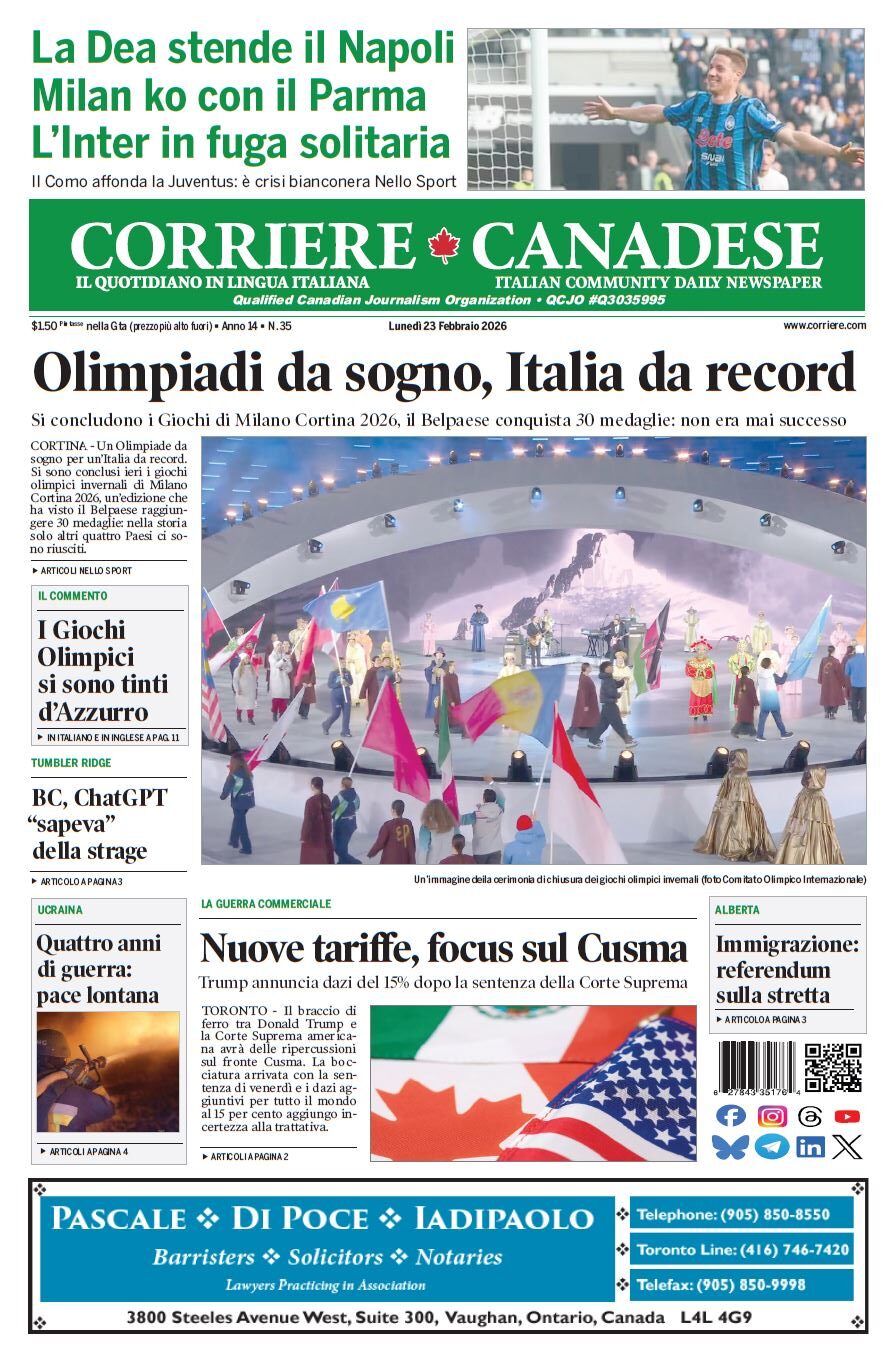 In edicola La nostra “vetrina” corriere canadese February 23, 2026 Clicca sull’immagine per ingrandirla More Articles by the Same Author: La nostra “vetrina”Il Terelle Social Club celebra 50 anni e premia i suoi giovani più promettentiL’MP Gasparro mobilita North York per tifare Wilson sulla pista di casaLa nostra “vetrina”CIBPA: Sabrina Marrelli nuova presidenteShare This Post - Condividi