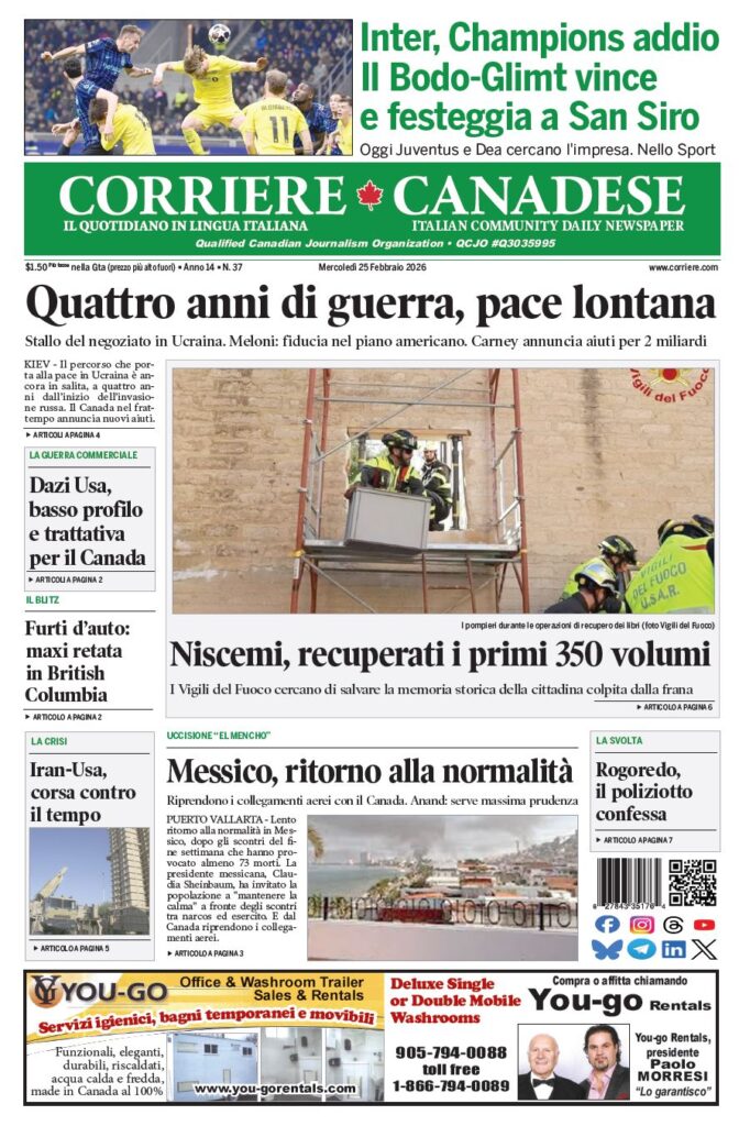 In edicola La nostra “vetrina” corriere canadese February 25, 2026 Clicca sull’immagine per ingrandirla More Articles by the Same Author: La nostra “vetrina”La nostra “vetrina”La nostra “vetrina”Il Terelle Social Club celebra 50 anni e premia i suoi giovani più promettentiL’MP Gasparro mobilita North York per tifare Wilson sulla pista di casaShare This Post - Condividi