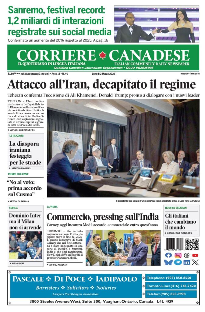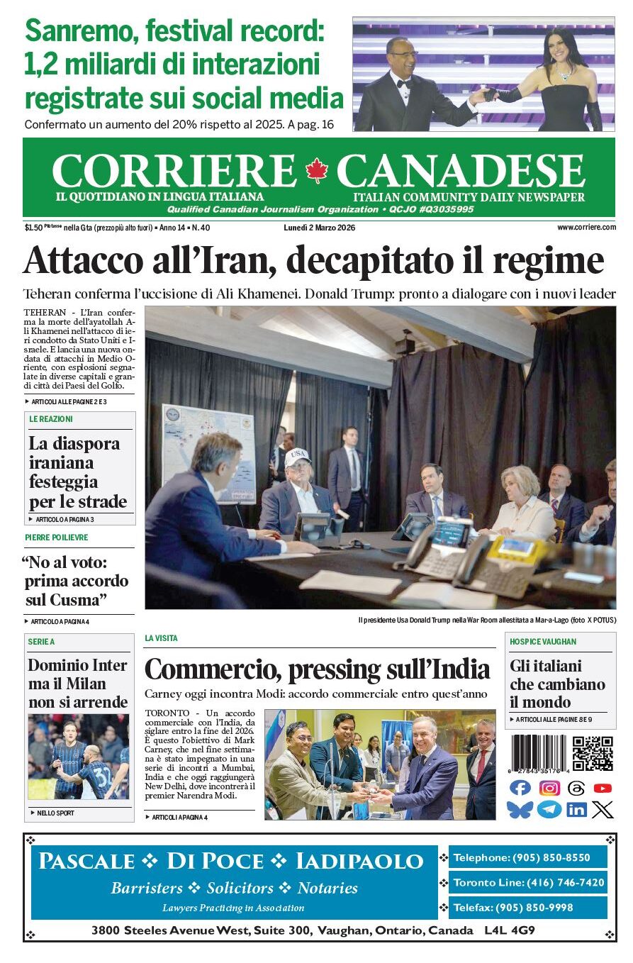 In edicola La nostra “vetrina” corriere canadese March 2, 2026 Clicca sull’immagine per ingrandirla More Articles by the Same Author: La nostra “vetrina”Firenze incanta tutti con il Premio ZeffirelliLa nostra “vetrina”I “maltagliati al rum di Augustus”I rigatoni più popolari: quelli con la pajataShare This Post - Condividi
