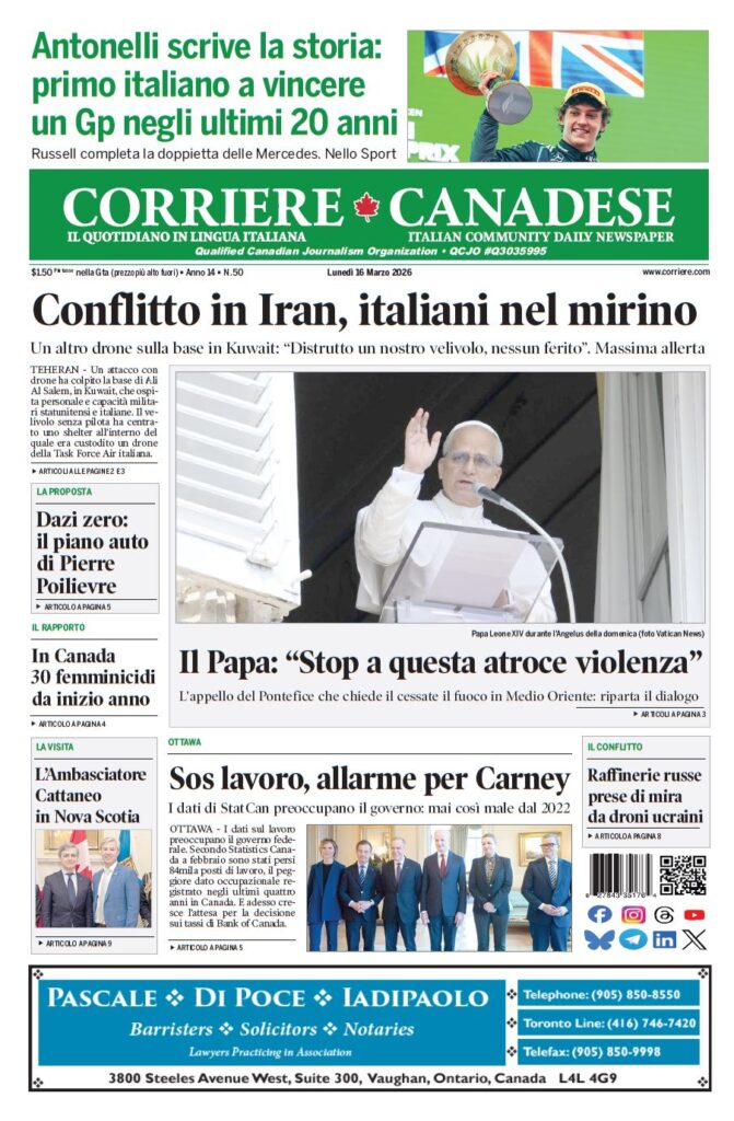 In edicola La nostra “vetrina” corriere canadese March 16, 2026 Clicca sull’immagine per ingrandirla More Articles by the Same Author: Arte e diplomazia culturale in Canada: l’Ambasciatore Cattaneo all’inaugurazione della mostra dei Marmi Torlonia a MontrealL’Ambasciatore Cattaneo in Nova Scotia e sulla nave “Alpino”La nostra “vetrina”La nostra “vetrina”Il “bordatino pisano”Share This Post - Condividi
