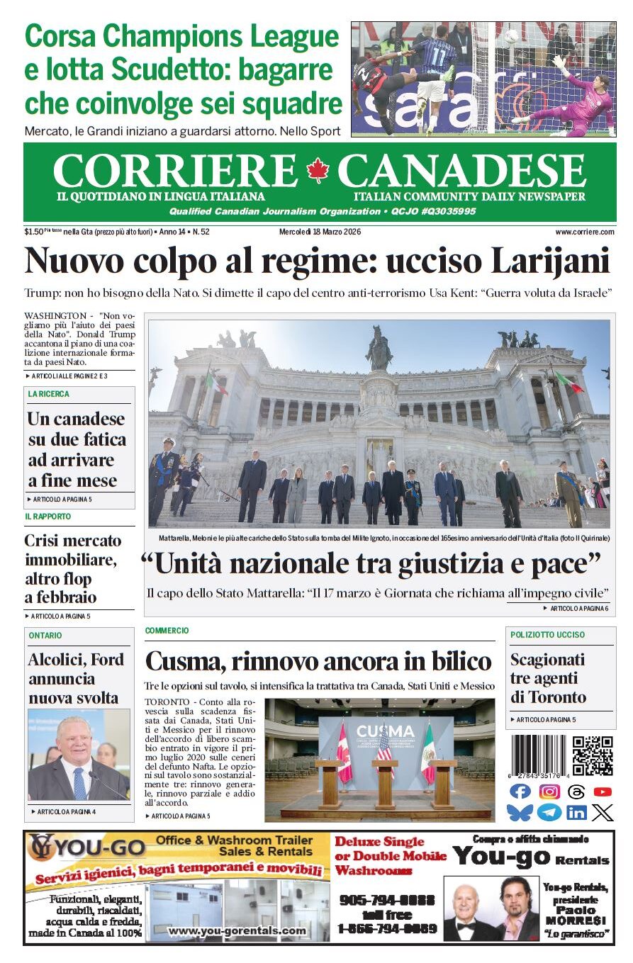 In edicola La nostra “vetrina” corriere canadese March 18, 2026 Clicca sull’immagine per ingrandirla More Articles by the Same Author: La nostra “vetrina”La nostra “vetrina”Arte e diplomazia culturale in Canada: l’Ambasciatore Cattaneo all’inaugurazione della mostra dei Marmi Torlonia a MontrealL’Ambasciatore Cattaneo in Nova Scotia e sulla nave “Alpino”La nostra “vetrina”Share This Post - Condividi