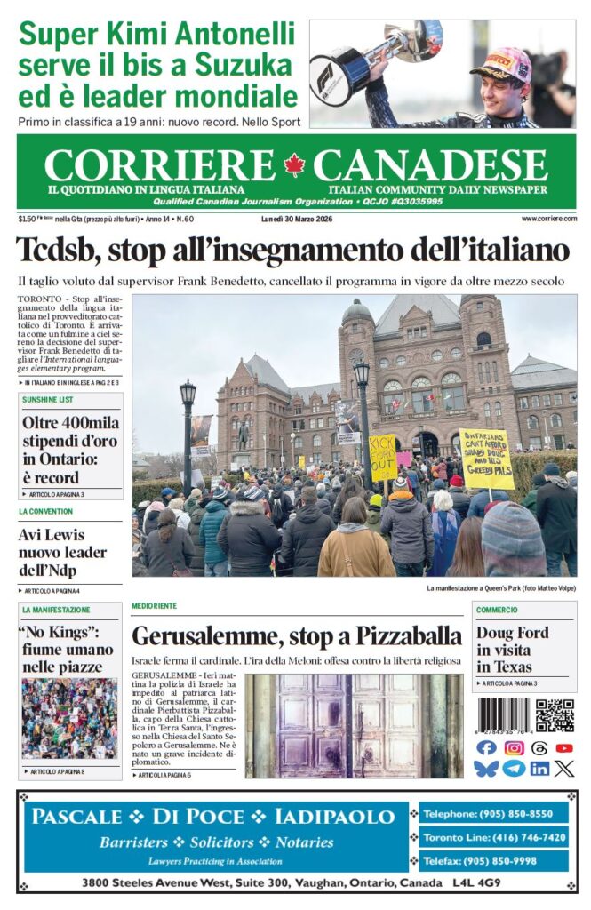 In edicola La nostra “vetrina” corriere canadese March 30, 2026 Clicca sull’immagine per ingrandirla More Articles by the Same Author: Lamborghini 2026: due pagine specialiLa nostra “vetrina”Il ponte che ha dato fastidio a qualcuno è indispensabile per Canada e UsaLa nostra “vetrina”La “salama da sugo”Share This Post - Condividi