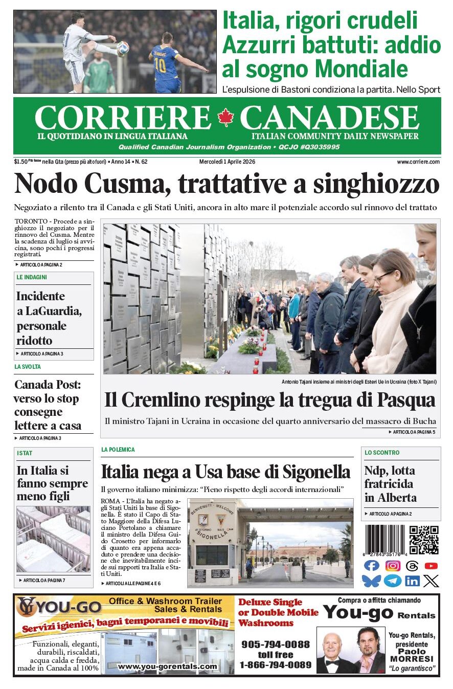 In edicola La nostra “vetrina” corriere canadese April 1, 2026 Clicca sull’immagine per ingrandirla More Articles by the Same Author: Giornata del Made in Italy, l’Ambasciatore Cattaneo in missione a TorontoLa “Cura” di De Francesco diventa un lucido incuboIl grande romanticismo al Jane Mallett Theatre con Sinfonia TorontoFotografia, musica e poesia in tempo di guerra: performance a VancouverLa nostra “vetrina”Share This Post - Condividi