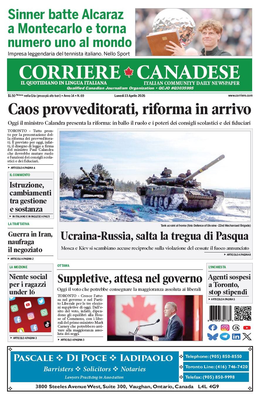 In edicola La nostra “vetrina” corriere canadese April 13, 2026 Clicca sull’immagine per ingrandirla More Articles by the Same Author: I trentanove giorni di guerra in Iran e la lezione che deve essere imparataLa nostra “vetrina”La nostra “vetrina”Le “bombette pugliesi”Gli spaghetti con ‘granseola’ e pomodoriniShare This Post - Condividi