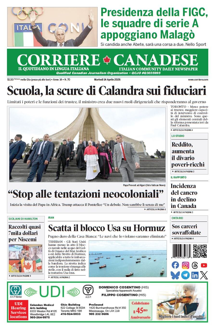 In edicola La nostra “vetrina” corriere canadese April 14, 2026 Clicca sull’immagine per ingrandirla More Articles by the Same Author: La nostra “vetrina”I trentanove giorni di guerra in Iran e la lezione che deve essere imparataLa nostra “vetrina”La nostra “vetrina”Le “bombette pugliesi”Share This Post - Condividi