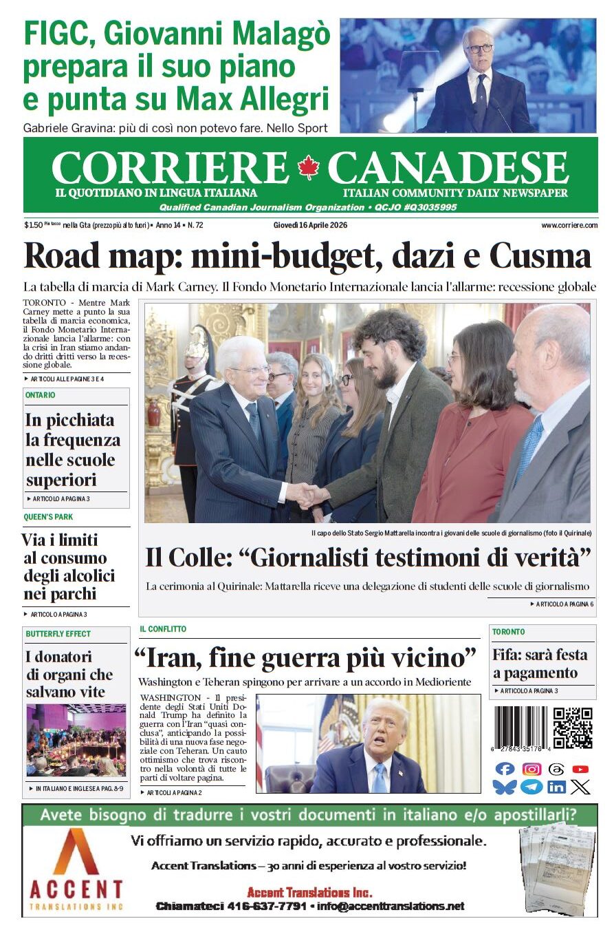 In edicola La nostra “vetrina” corriere canadese April 16, 2026 Clicca sull’immagine per ingrandirla More Articles by the Same Author: La “zingara ischitana”Antica Napoli: i vermicelli allo scammaroLa nostra “vetrina”Vertice Italia-Canada con Guariglia, segretario generale della FarnesinaLa nostra “vetrina”Share This Post - Condividi