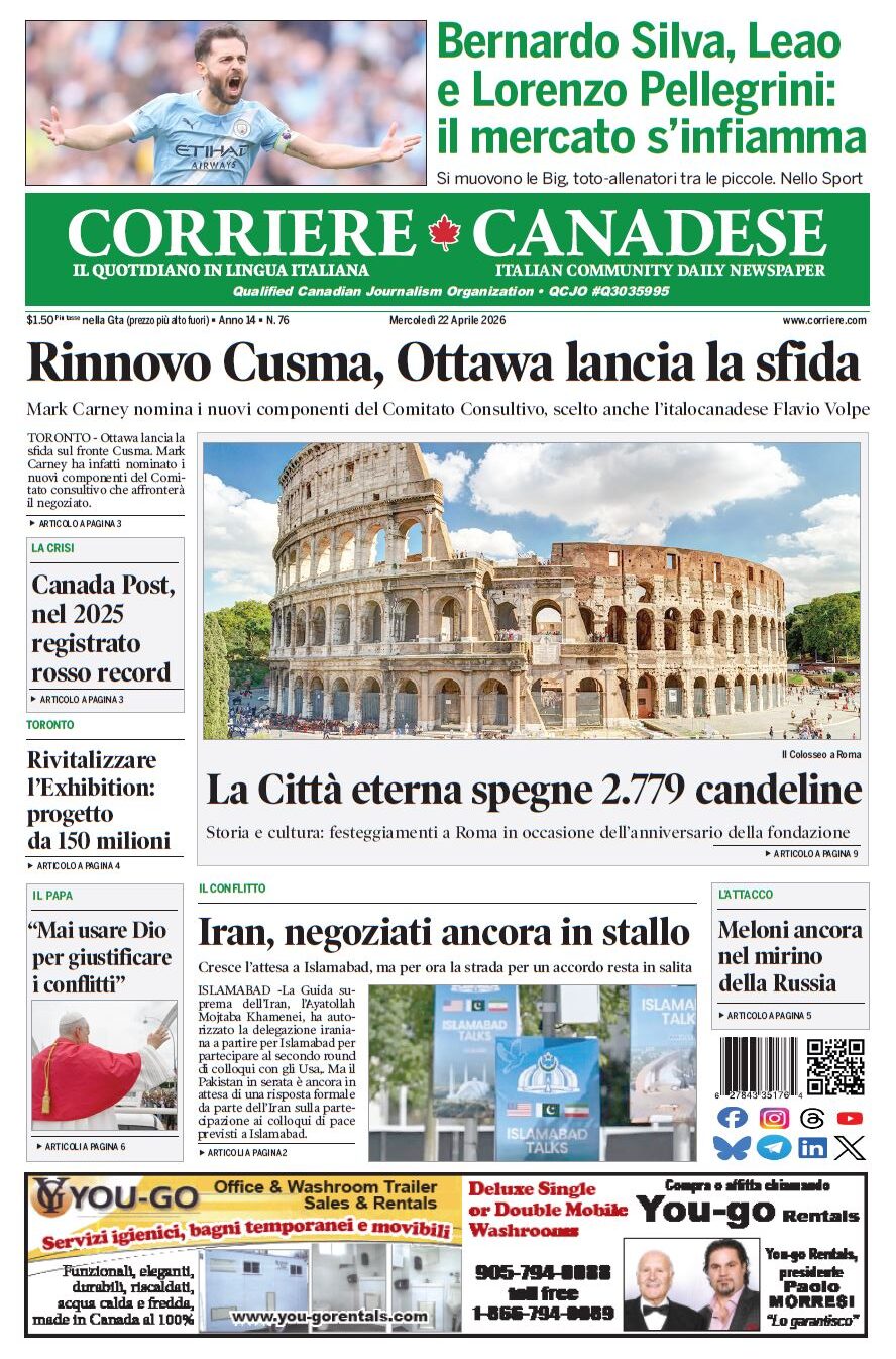 In edicola La nostra “vetrina” corriere canadese April 22, 2026 Clicca sull’immagine per ingrandirla More Articles by the Same Author: “Dietro le riforme ci sono soldi e centesimi, non l’istruzione”“Dollars and Cents Behind Reforms, not Education”Organi: tanti trapianti, ma troppe persone ancora in attesaLa nostra “vetrina”Cordoglio per la scomparsa di Antonio SummaShare This Post - Condividi