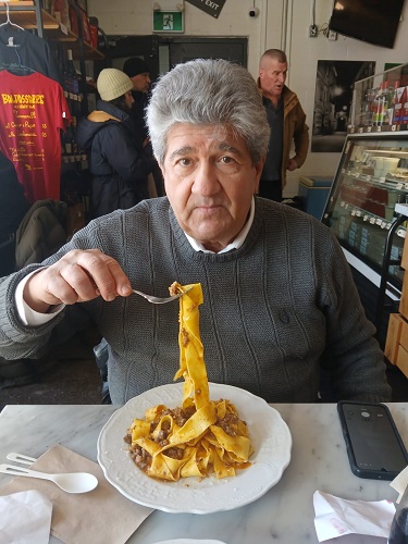 Nella foto in alto, Mario Zinni con l’Onorevole Joe Volpe davanti al Consolato d’Italia a Toronto e, qui sotto, lo stesso Mario nel ristorante italiano dove ha festeggiato con la figlia
