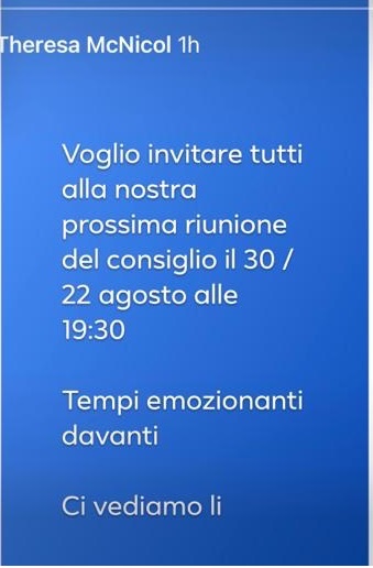 Trustee Mc Nicol who sparked and fueled the crisis with her besmirching of the five colleagues by equating them with the American criminal underworld has done nothing to correct the situation. In fact, she heaped scorn on them by issuing social media messages in Italian because, in her view, it is the only language they understand (in the pics below, the posts by Mc Nicol in English and Italian).