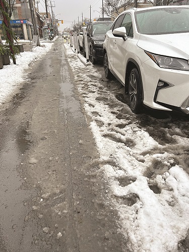 You did not know? These are the summer bicycles lanes found in between the non-shoveled sidewalks and the white City of Toronto poles indicating the very few parking spots left for drivers along Eglinton Ave. West, and elsewhere.