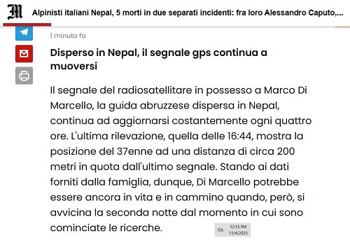 Si continua però a sperare, mentre scriviamo, per l’alpinista italocanadese che era con Cocco, Marco Di Marcello. Come scrive Il Messaggero, infatti, il segnale del radiosatellitare in suo possesso ieri continuava ad aggiornarsi costantemente ogni quattro ore: l’ultima rilevazione, quella delle 16.44 (ora italiana), mostrava la posizione del 37enne ad una distanza di circa 200 metri in quota dall’ultimo segnale. Stando ai dati forniti dalla famiglia, dunque, Di Marcello – scrive ancora Il Messaggero come si vede nello screenshot qui sotto – potrebbe essere ancora in vita e in cammino.