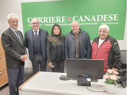 Nella foto in alto, da sinistra: l’Editore Joe Volpe, il sindaco Luca Festino, il vicesindaco Angela Maria Grieco, l’ex sindaco Mario Romanelli e Danny Montesano di Lido Construction nella redazione del Corriere Canadese