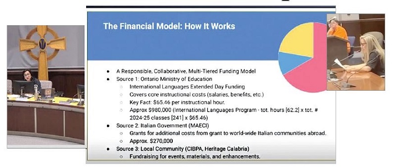 La trustee Saggese ha svolto una presentazione nel tentativo di dimostrare che l’offerta è “chiarissima” (parole mie): (1) un numero critico di studenti per garantire il successo delle iscrizioni e interruzioni minime per l’adeguamento degli orari degli autobus; (2) un curriculum esistente con personale qualificato disponibile; (3) studenti disponibili/entusiasti; (4) genitori alquanto convinti; (5) sostegno finanziario dal settore privato; e (6) un contributo finanziario di una terza parte interessata: il governo italiano. Costo per lo YCDSB? Praticamente zero!